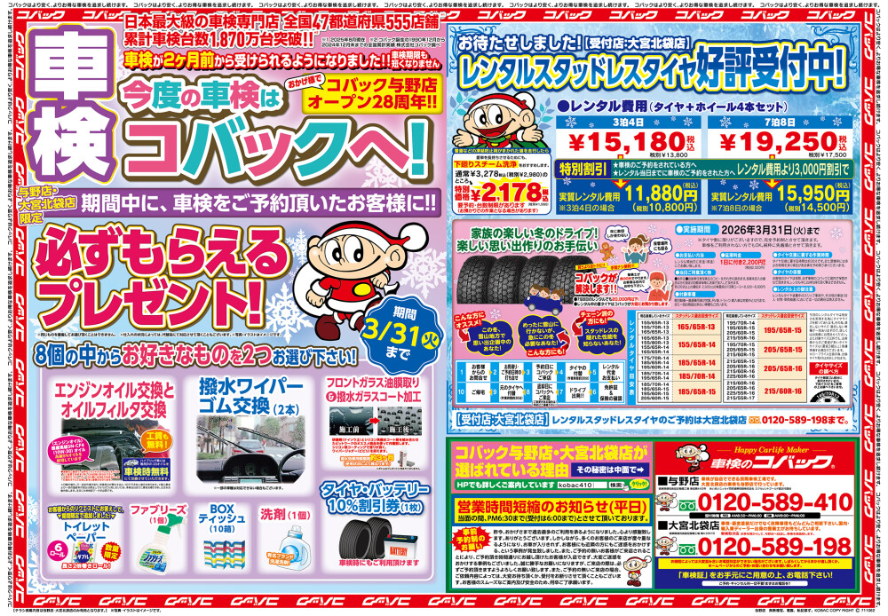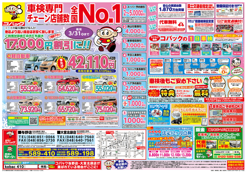 埼玉県さいたま市、さいたま新都心駅から徒歩5分の【コバック与野店】と、産業道路沿いの【コバック大宮北袋店】を構える松本自動車では、年間6,000台以上の車検を地域の皆様からお任せいただいています。